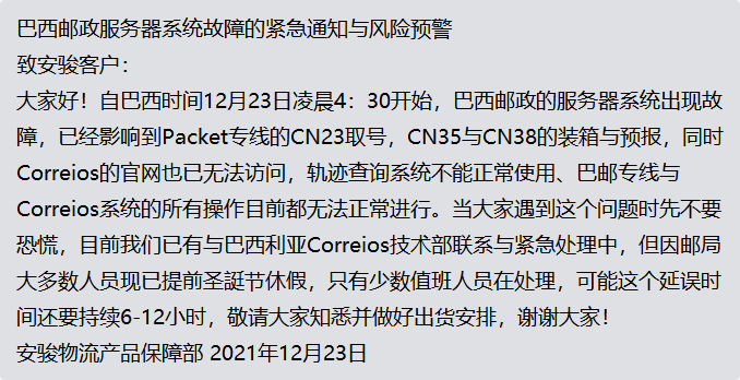 巴西時(shí)間12月23日凌晨4:30巴西郵政Correios的網(wǎng)站、物流服務(wù)系統(tǒng)與軌跡查詢系統(tǒng)同時(shí)受到黑客攻擊,服務(wù)器出現(xiàn)崩潰,與巴西郵政直聯(lián)的所有業(yè)務(wù)一時(shí)間都無法正常運(yùn)營,其中包括巴西本地派送業(yè)務(wù),跨境Packet專線業(yè)務(wù)以及萬國郵聯(lián)對(duì)接巴西郵政系統(tǒng)的業(yè)務(wù)都有受到影響而不能正常作業(yè)。受此影響每天預(yù)計(jì)有1000萬個(gè)包裹被延誤,以巴西跨境物流包裹為主要承運(yùn)對(duì)象的貨運(yùn)包機(jī)將會(huì)面臨空艙運(yùn)輸帶來的損失。