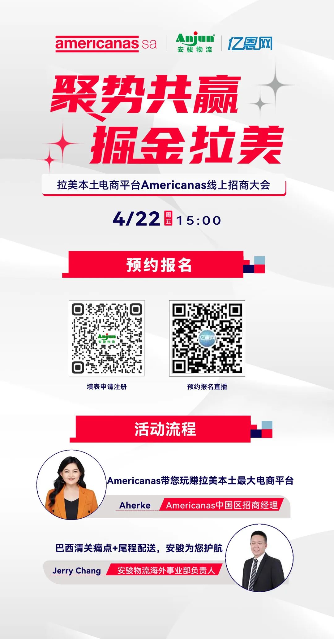 4月22日(本周五)15:00,拉美跨境電商物流的領軍者-安駿物流,聯(lián)合Americanas將舉辦國內(nèi)首場線上招商,參與直播并成功注冊的賣家,將享受限時傭金折扣優(yōu)惠。