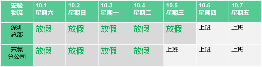 10.5日東莞倉庫正常收貨,10.6日深圳總部正常上班。