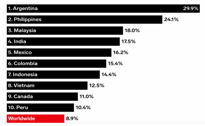 研究公司Insider Intelligence最新報告揭曉了2023年電商增長最快的TOP10國家,根據(jù)其對今年的預(yù)測,這十個市場的增長將高于世界平均水平8.9%。其中排名第二的菲律賓銷售額漲幅預(yù)計增幅為24.1%,阿根廷以29.9%的高增幅排名第一。