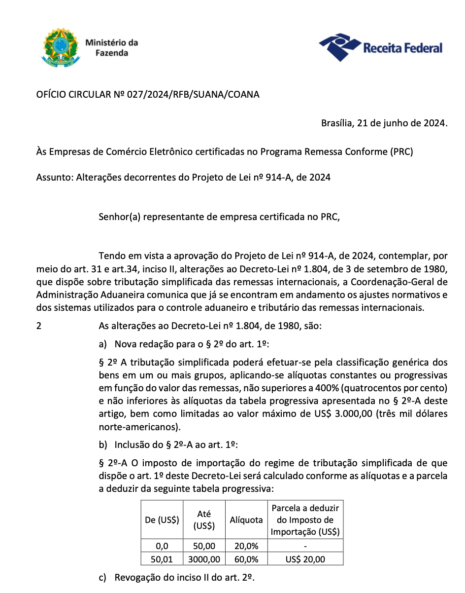 當(dāng)?shù)貢r(shí)間6月25日,巴西聯(lián)邦稅局在其官方網(wǎng)站上以致PRC電子商務(wù)平臺(tái)公開函的方式向外界公布了本輪針對(duì)跨境包裹征收進(jìn)口稅的具體方案及部分細(xì)節(jié)。具體內(nèi)容有以下三點(diǎn):一、將對(duì)50美元以下的所有進(jìn)口電商包裹增收20%的進(jìn)口稅;二、對(duì)50-3000美元的進(jìn)口電商包裹征收60%的進(jìn)口稅,但可在總進(jìn)口稅金中減免每個(gè)包裹20美元;三、加入合規(guī)繳稅方案(即PRC方案)的電商平臺(tái)可獲得提前預(yù)申報(bào)及快速清關(guān)放行的便利。在此公開函發(fā)布之前,巴西聯(lián)邦稅局已有召開了兩次由跨境電商平臺(tái)、物流商、行業(yè)協(xié)會(huì)與政府政策顧問等參加的線上聽證會(huì),并提前轉(zhuǎn)達(dá)了以上公告內(nèi)容,但沒有說明新政策具體實(shí)行的時(shí)間,目前分析是此法令還沒有完成最后的審批程序。